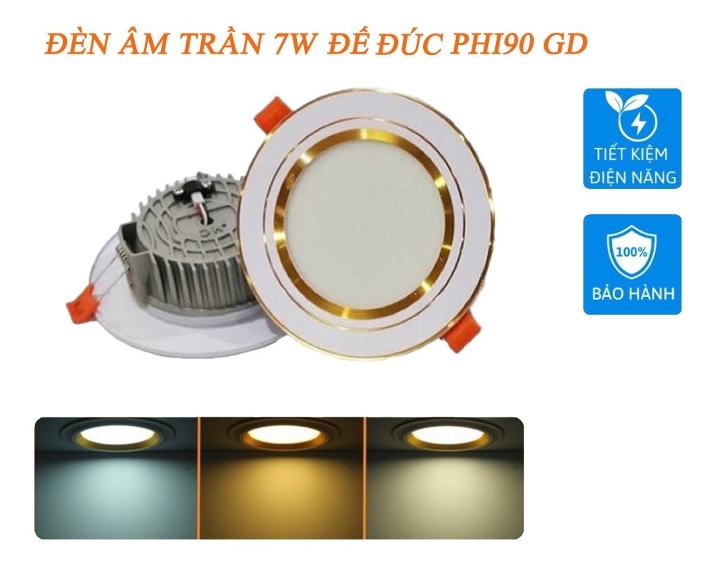 Đèn âm trần 1CĐ đế đúc viền vàng pi90 7w/1CĐ-GD